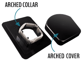 An arched collar and cap help snow slide off the vent, avoiding build-up behind the vent.